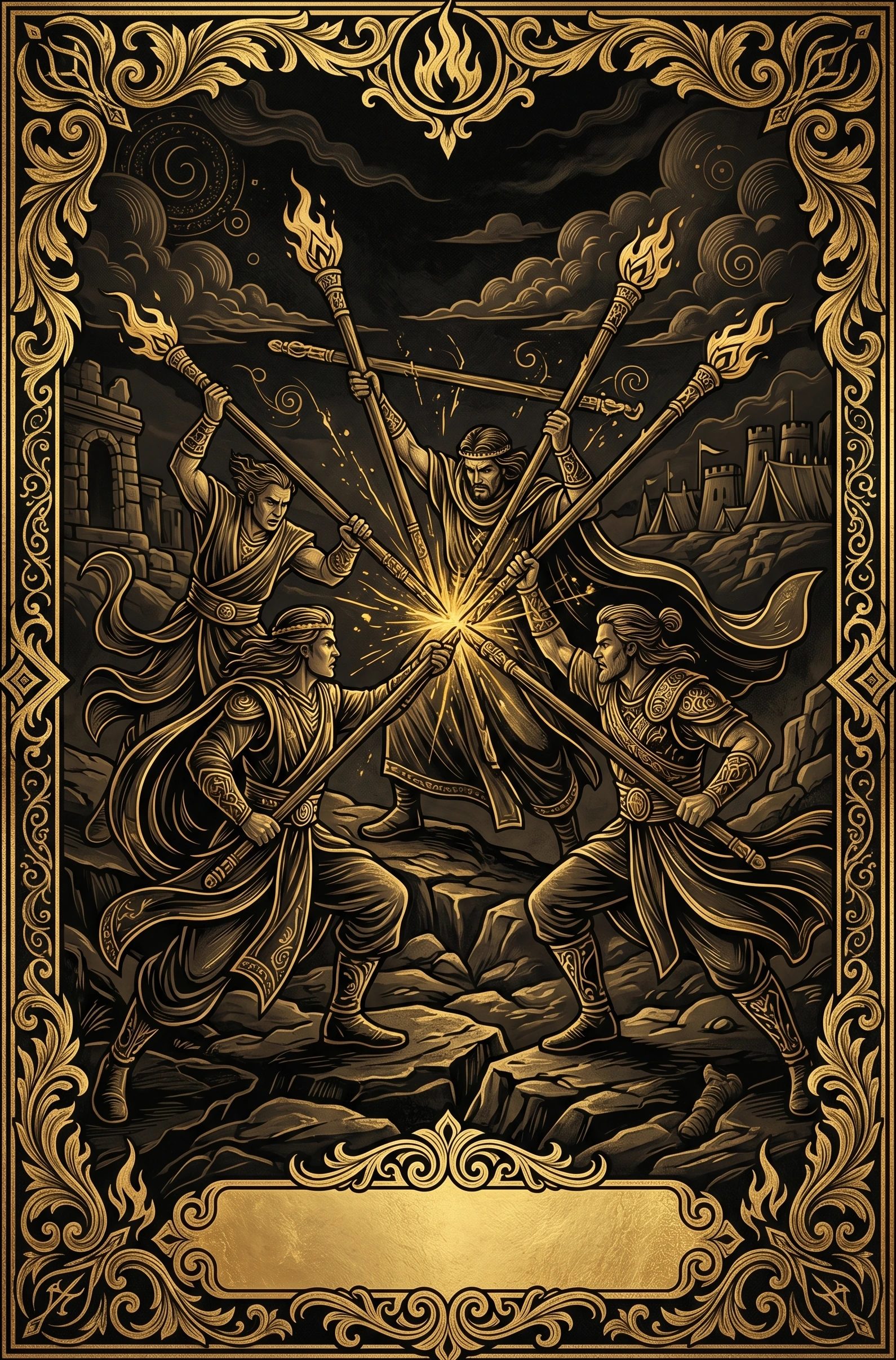 Five of Wands upright in love highlights chemistry mixed with conflict, testing whether attraction can survive difference. It brings action, desire, confidence, and creative propulsion into close relationships in a way that matches the card's stage of friction, disruption, and the test that exposes weakness. Healthy progress comes from naming what is real, responding consistently, and letting connection develop through behavior rather than fantasy alone.
